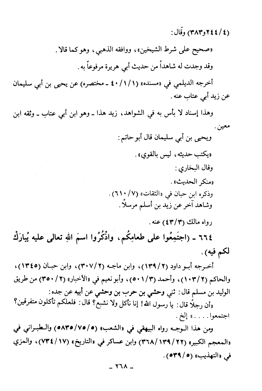 664 - " اجتمعوا على طعامكم واذكروا اسم الله تعالى عليه يبارك لكم فيه ".