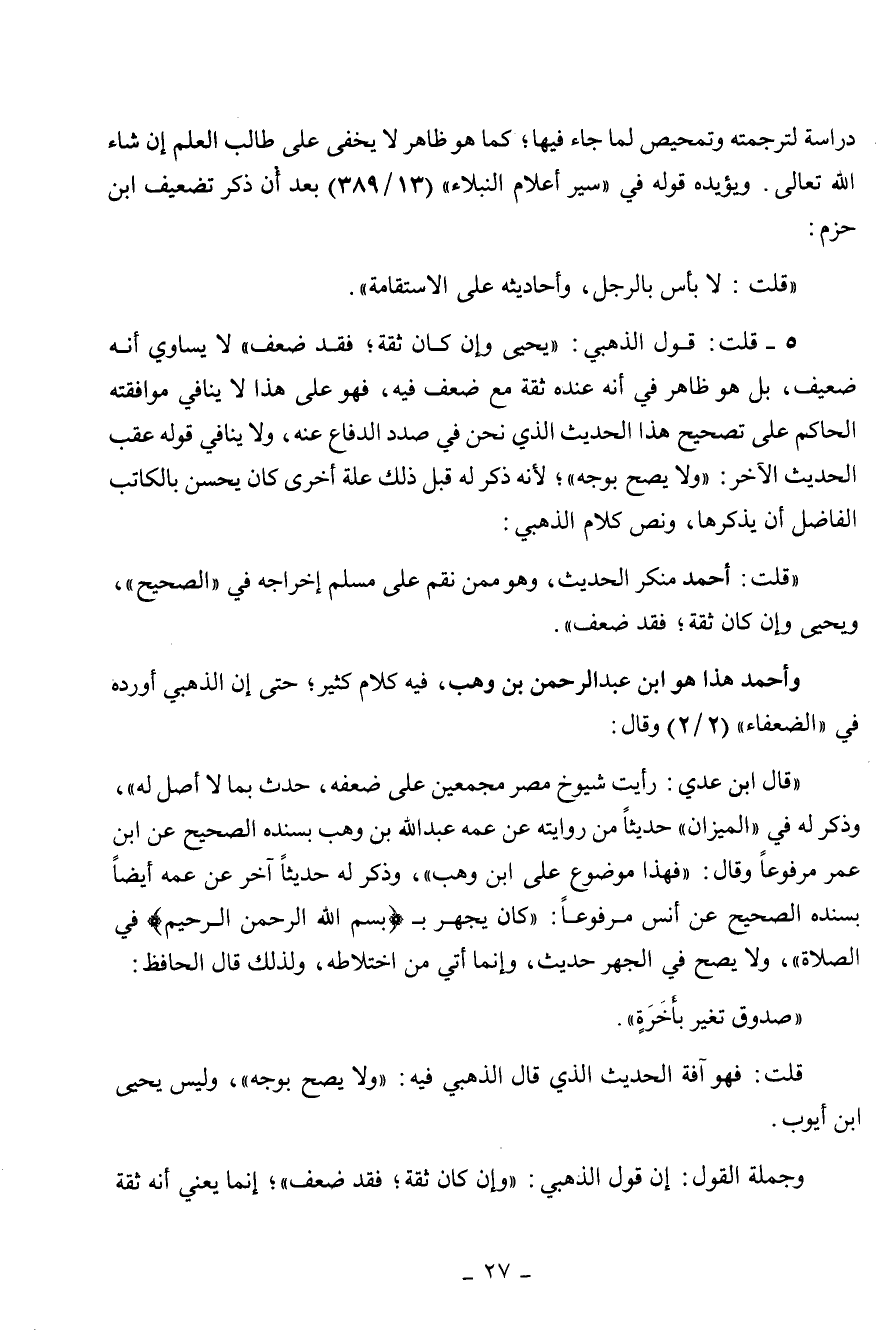 5 - قلت: قول الذهبي " يحيى وإن كان ثقة، فقد ضعف " لا يساوي أنه ضعيف، بل