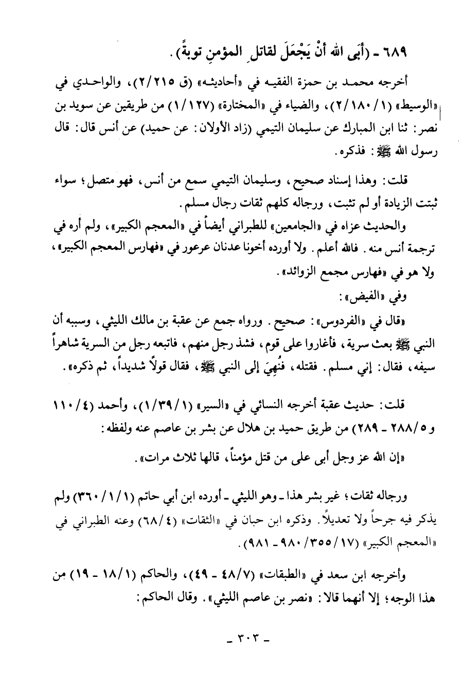 689 - " أبى الله أن يجعل لقاتل المؤمن توبة ".