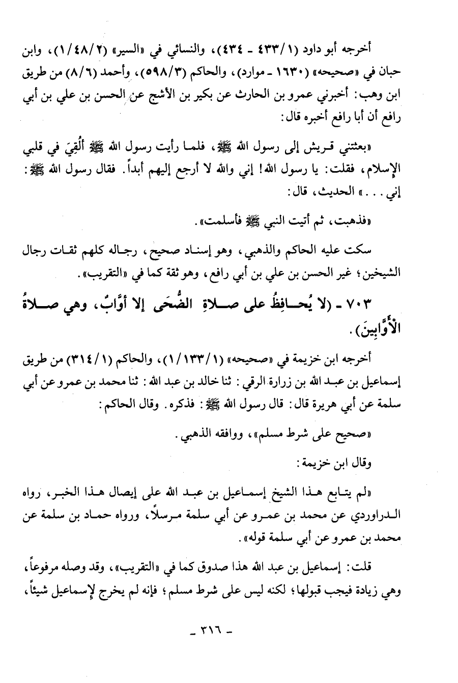 703 - " لا يحافظ على صلاة الضحى إلا أواب وهي صلاة الأوابين ".