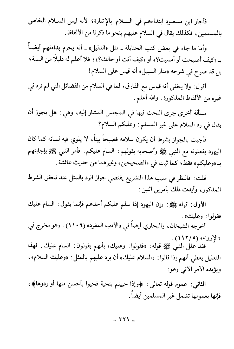 الآتي وهو: الثاني: عموم قوله تعالى * (وإذا حييتم بتحية فحيوا بأحسن منها