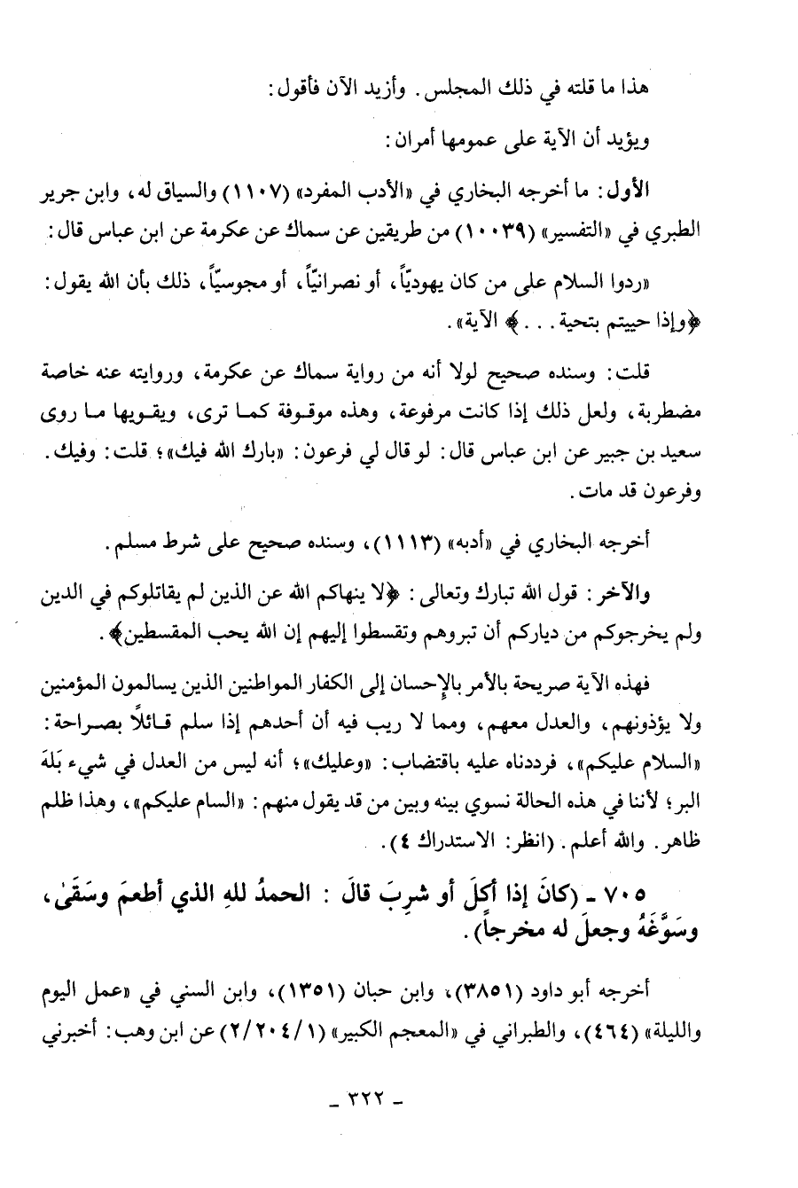 705 - " كان إذا أكل أو شرب قال: الحمد لله الذي أطعم وسقى وسوغه وجعل له مخرجا ".