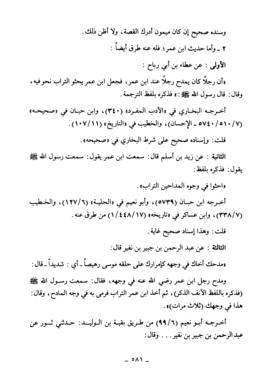 أخذ ابن عمر التراب فرمى به في وجه المادح، وقال: هذا في وجهك (ثلاث مرات)
