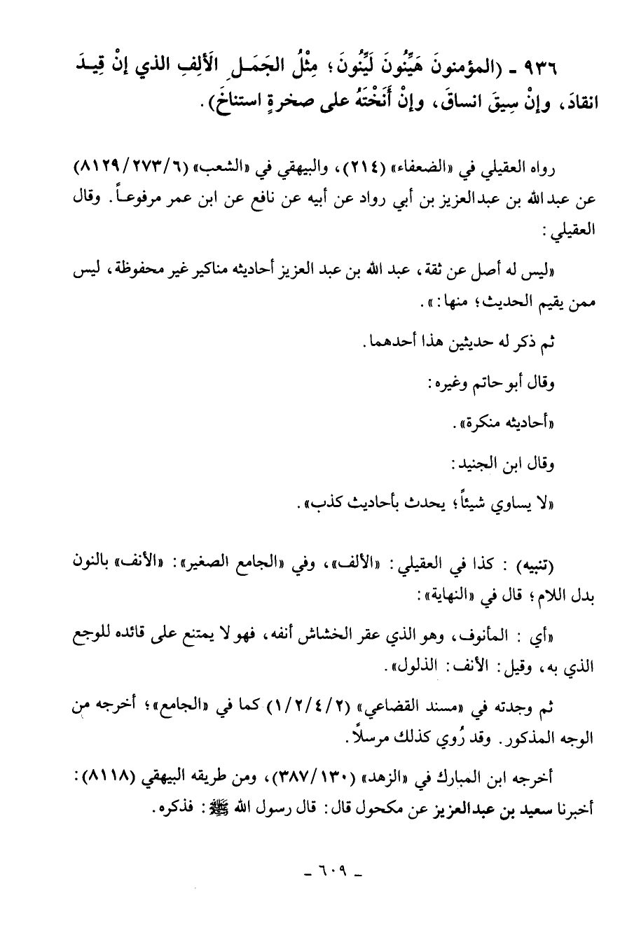 936 - " المؤمنون هينون لينون مثل الجمل الألف الذي إن قيد انقاد وإن سيق انساق وإن