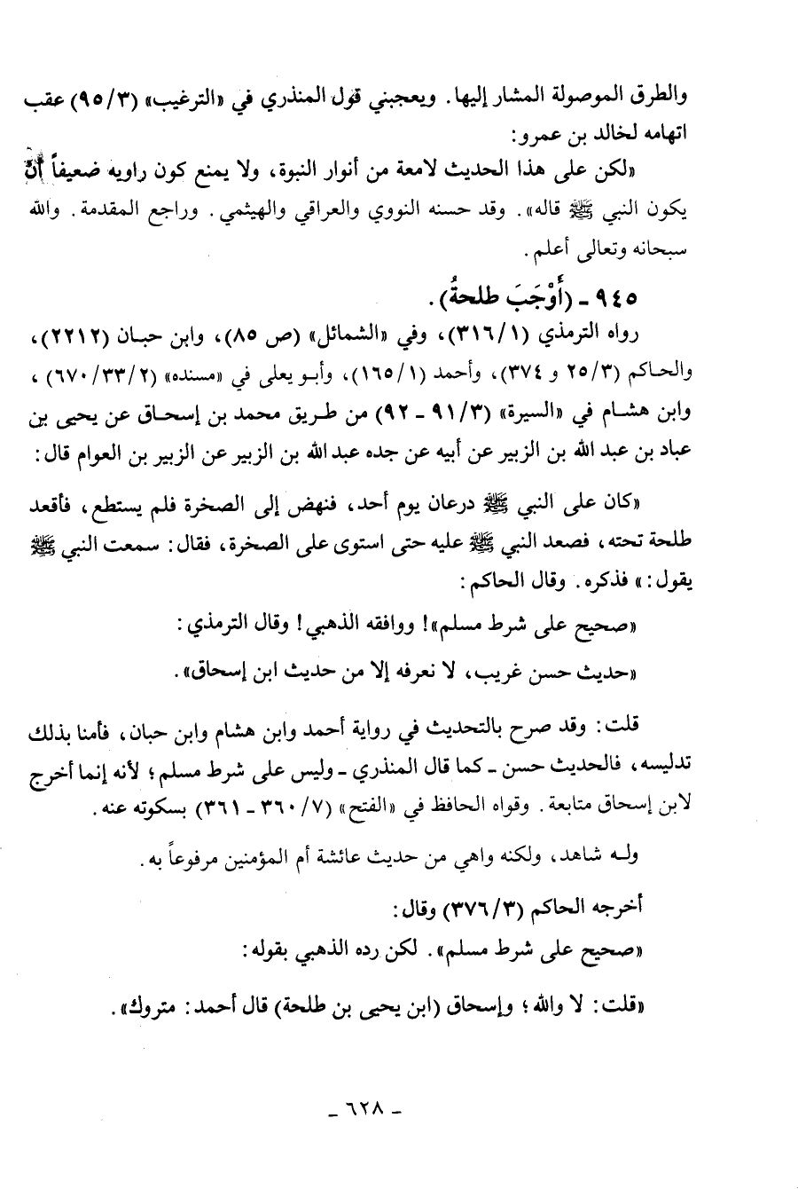 الله عليه وسلم درعان يوم أحد فنهض إلى الصخرة فلم يستطع فأقعد طلحة تحته فصعد