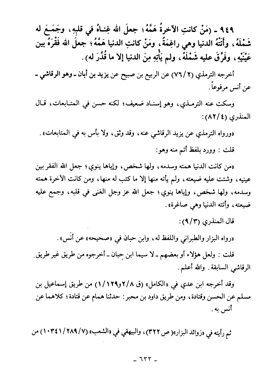 949 - " من كانت الآخرة همه جعل الله غناه في قلبه وجمع له شمله وأتته الدنيا وهي