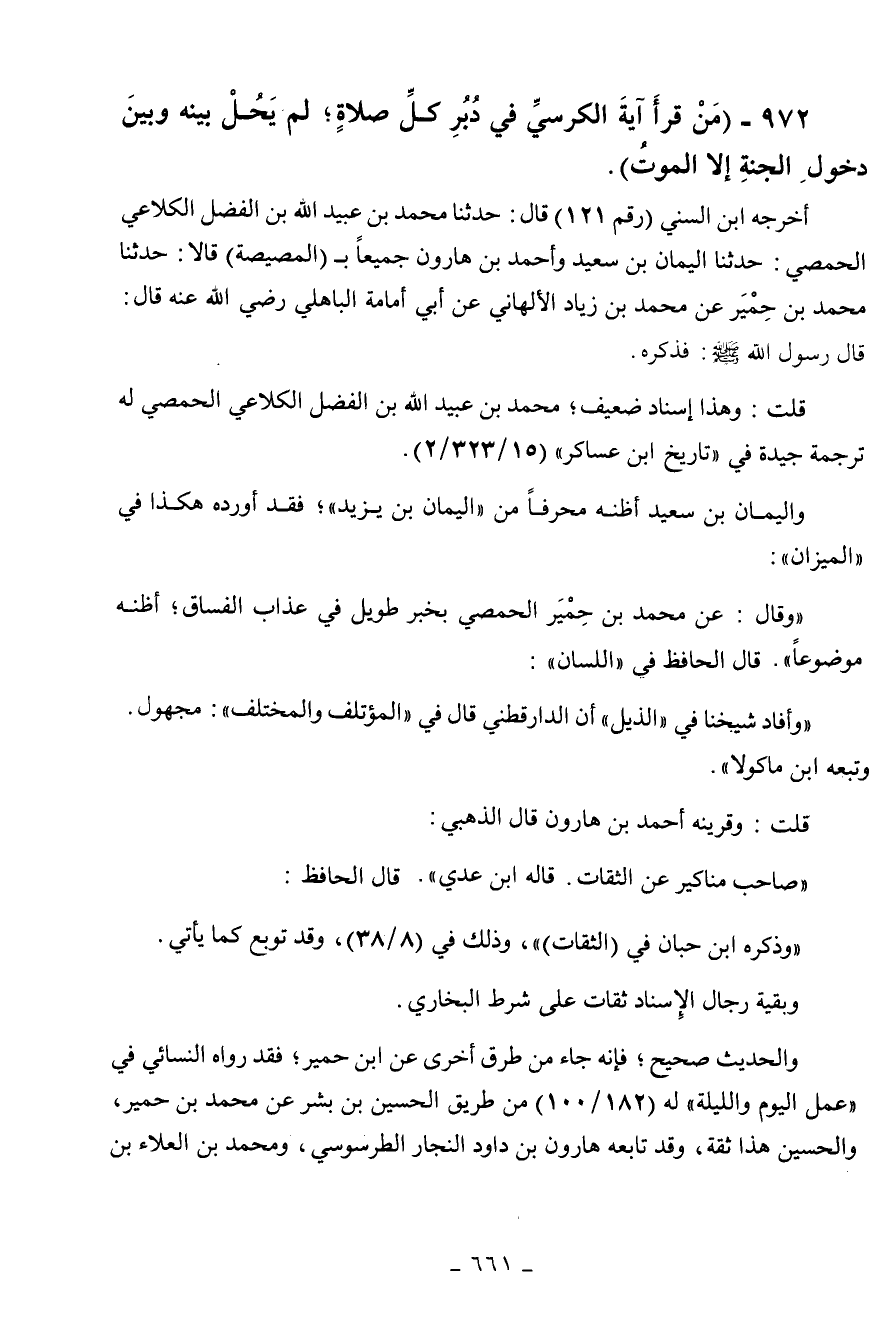 972 - " من قرأ آية الكرسي في دبر كل صلاة لم يحل بينه وبين دخول الجنة إلا الموت ".