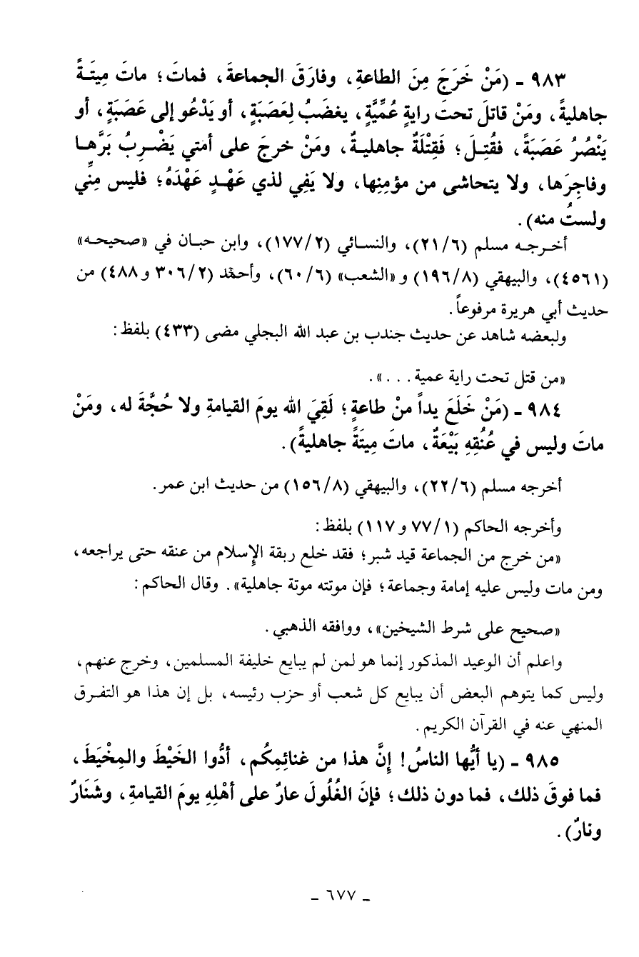 983 - " من خرج من الطاعة وفارق الجماعة، فمات مات ميتة جاهلية ومن قاتل تحت راية