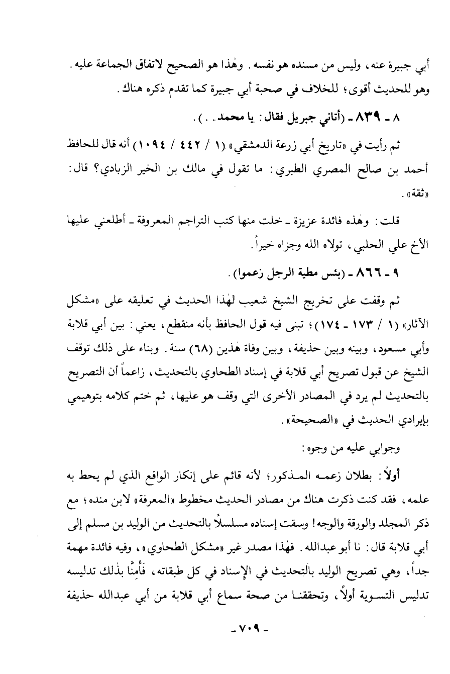ثم وقفت على تخريج الشيخ شعيب لهذا الحديث في تعليقه على "مشكل الآثار" (1/173-174) ؛ تبنى فيه قول الحافظ بأنه منقطع، يعني: بين أبي قلابة وأبي مسعود، وبينه وبين حذيفة، وبين وفاة هذين (68) سنة. وبناء على ذلك توقف الشيخ عن قبول تصريح أبي قلابة في إسناد الطحاوي بالتحديث، زاعمًا أن التصريح بالتحديث لم يرد في المصادر الأخرى التي وقف هو عليها، ثم ختم كلامه بتوهيمي بإيرادي الحديث في "الصحيحة".