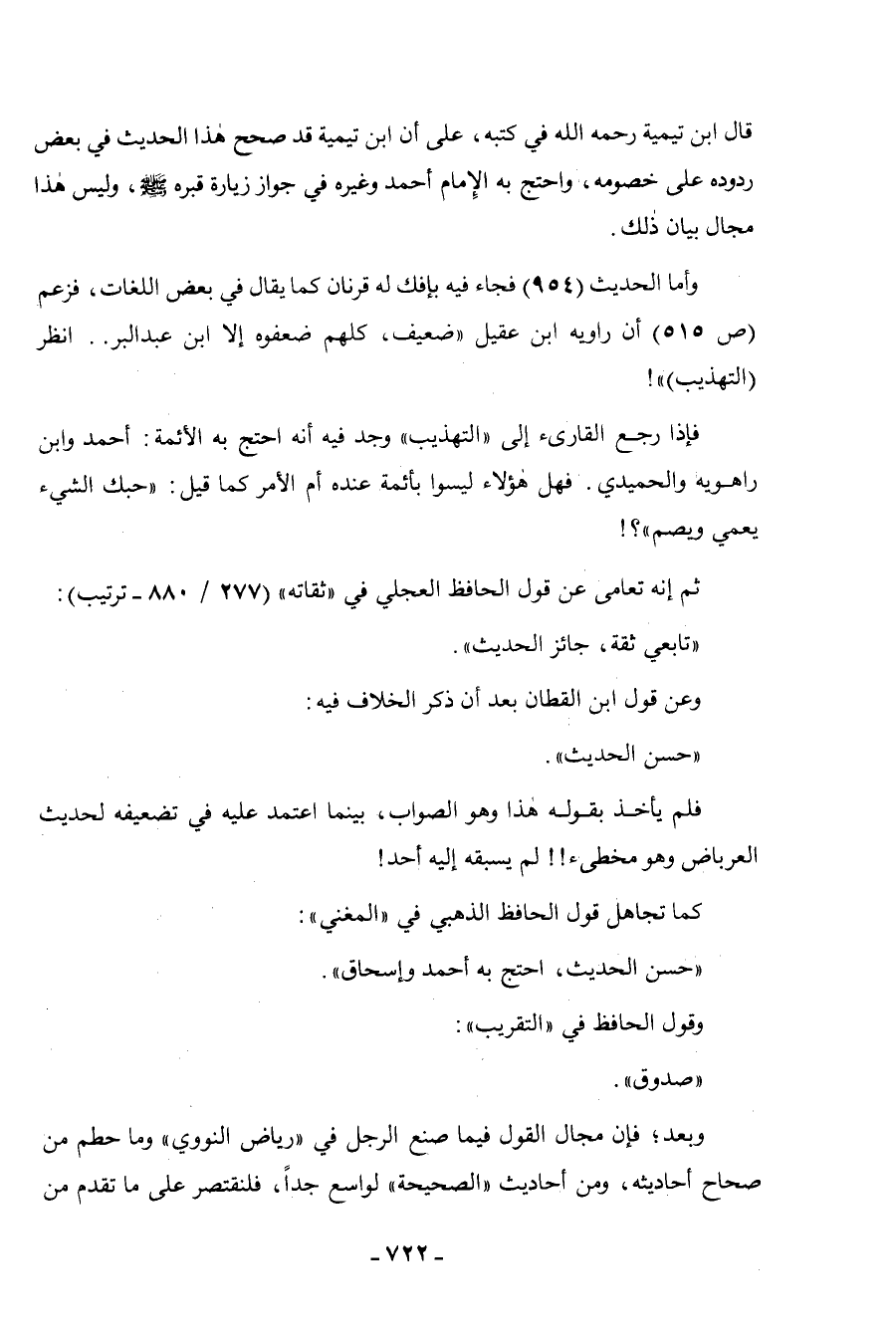 قال ابن تيمية رحمه الله في كتبه، على أن ابن تيمية قد صحح هذا الحديث في بعض ردوده على خصومه، واحتج به الإِمام أحمد وغيره في جواز زيارة قبره - صلى الله عليه وسلم -، وليس هذا مجال بيان ذلك.