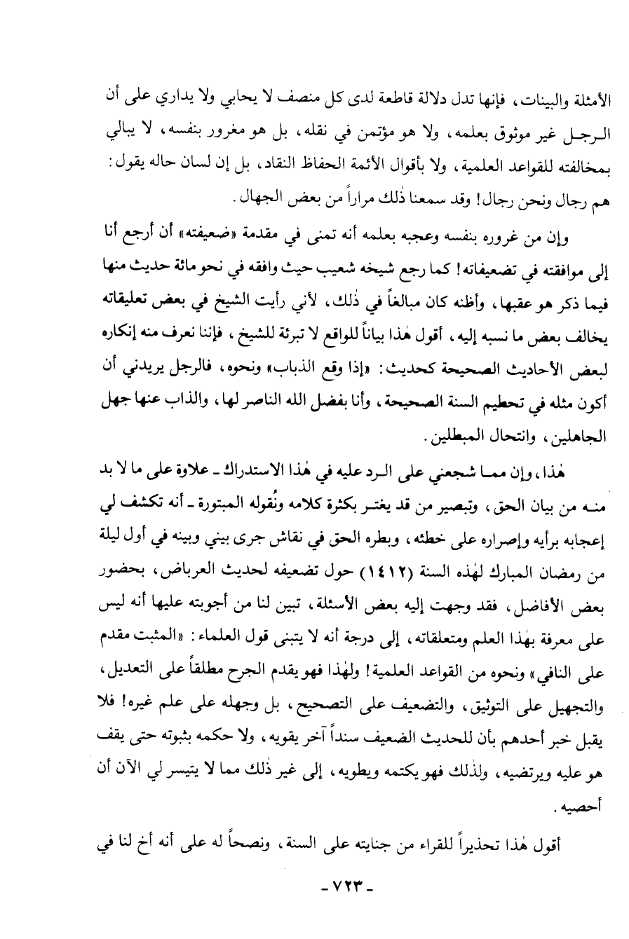 الأمثلة والبينات، فإنها تدل دلالة قاطعة لدى كل منصف لا يحابي ولا يداري على أن الرجل غير موثوق بعلمه، ولا هو مؤتمن في نقله، بل هو مغرور بنفسه، لا يبالي بمخالفته للقواعد العلمية، ولا بأقوال الأئمة الحفاظ النقاد، بل إن لسان حاله يقول: هم رجال ونحن رجال! وقد سمعنا ذلك مرارًا من بعض الجهال.