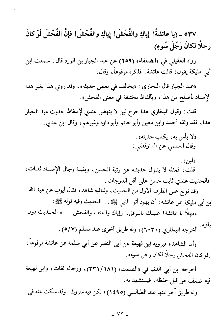 537 - " يا عائشة إياك والفحش إياك والفحش، فإن الفحش لو كان رجلا لكان رجل سوء ".