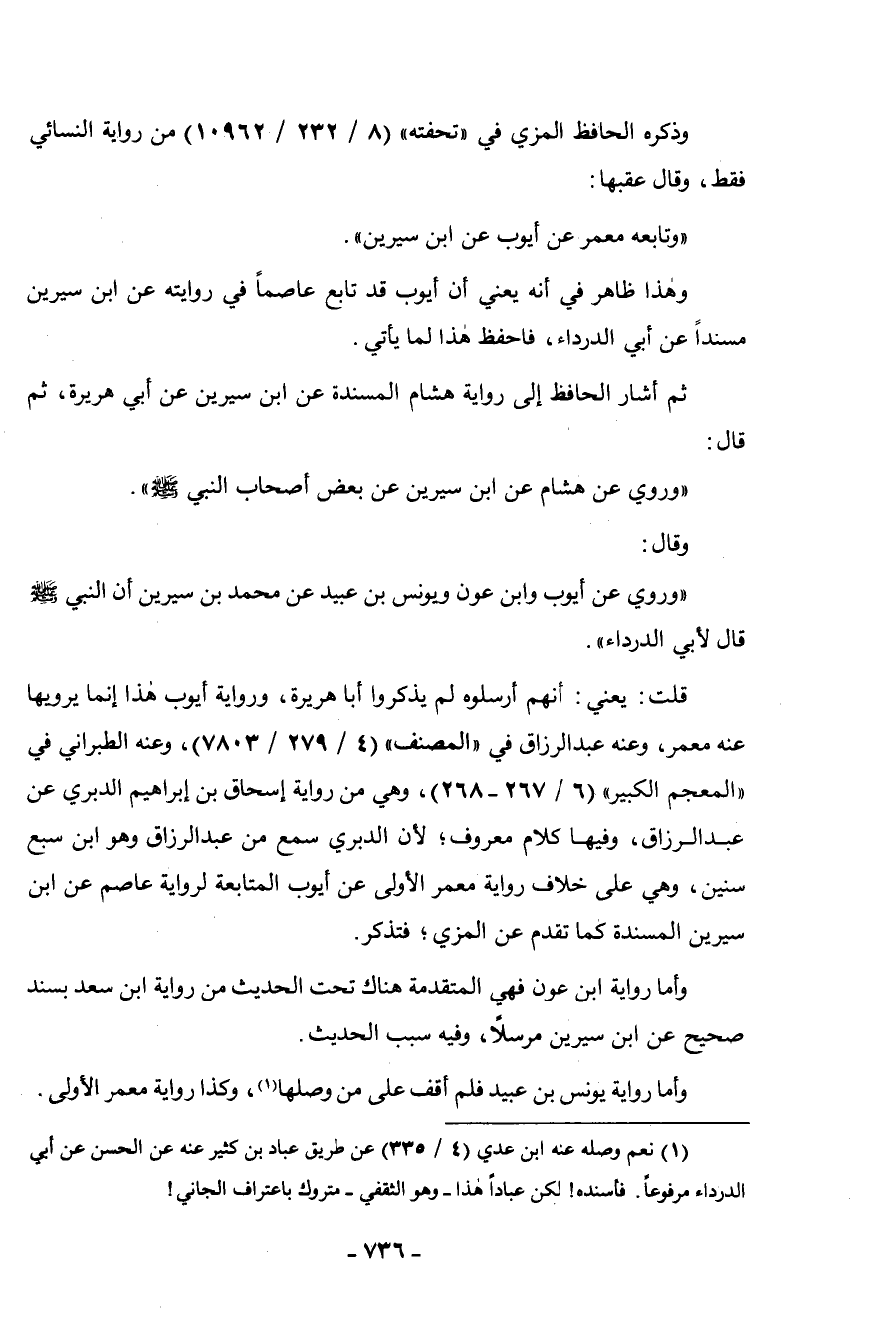 "وروي عن أيوب وابن عون ويونس بن عبيد عن محمد بن سيرين أن النبي - صلى الله عليه وسلم - قال لأبي الدرداء".