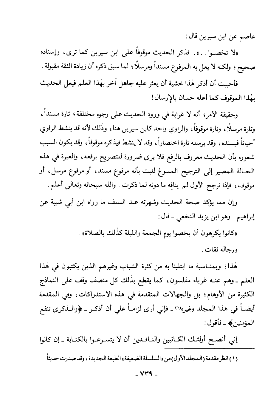 "لا تخصوا..". فذكر الحديث موقوفًا على ابن سيرين كما ترى، وإسناده صحيح؛ ولكنه لا يعل به المرفوع مسندًا ومرسلًا؛ لما سبق ذكره أن زيادة الثقة مقبولة.