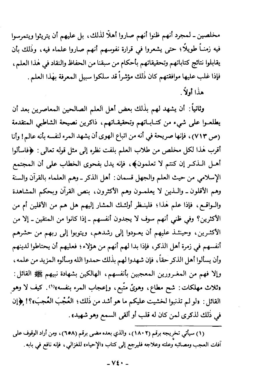 وثانيًا: أن مشهد لهم بذلك بعض أهل العلم الصالحين المعاصرين بعد أن يطلعوا على شيء من كتاباتهم وتحقيقاتهم، ذاكرين نصيحة الشاطبي المتقدمة (ص 713) ، فإنها صريحة في أنه من اتباع الهوى أن يشهد المرء لنفسه بأنه عالم! وأنا أقرب هذا لكل مخلص من طلاب العلم بلفت نظره إلى مثل قوله تعالى: {فَاسْأَلُوا أَهْلَ الذِّكْرِ إِنْ كُنْتُمْ لَا تَعْلَمُونَ} ، فإنه يدل بفحوى الخطاب على أن المجتمع الإسلامي من حيث العلم والجهل قسمان: أهل الذكر -وهم العلماء بالقرآن والسنة وهم الأقلون- والذين لا يعلمون وهم الأكثرون، بنص القرآن وبحكم المشاهدة والواقع، فإذا علم هذا؛ فلينظر أولئك المشار إليهم هل هم من الأقلين أم من الأكثرين؟ وفي ظني أنهم سوف لا يجدون أنفسهم -إذا كانوا من المتقين- إلا من الأكثرين، وحينئذ عليهم أن يعودوا إلى رشدهم، ويتوبوا إلى ربهم من حشرهم أنفسهم في زمرة أهل الذكر، فإذا بدا لهم أنهم من هؤلاء؛ فعليهم أن يحتاطوا لدينهم وأن يسألوا أهل الذكر حقًا، فإن شهدوا لهم بذلك حمدوا الله وسألوه المزيد من علمه، وإلا فهم من المغرورين المعجبين بأنفسهم، الهالكين بشهادة نبيهم - صلى الله عليه وسلم - القائل: "ثلاث مهلكات: شح مطاع، وهوىً متّبع، وإعجاب المرء بنفسه" (¬1) . كيف لا وهو القائل: "لو لم تذنبوا لخشيت عليكم ما هو أشد من ذلك؛ العُجْبَ العُجبَ"؟! {إِنَّ فِي ذَلِكَ لَذِكْرَى لِمَنْ كَانَ لَهُ قَلْبٌ أَوْ أَلْقَى السَّمْعَ وَهُوَ شَهِيدٌ} .