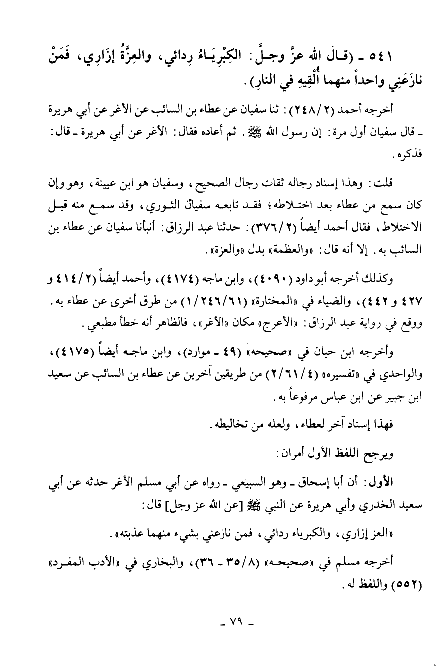 541 - " قال الله عز وجل: الكبرياء ردائي والعزة إزاري، فمن نازعني واحدا منهما