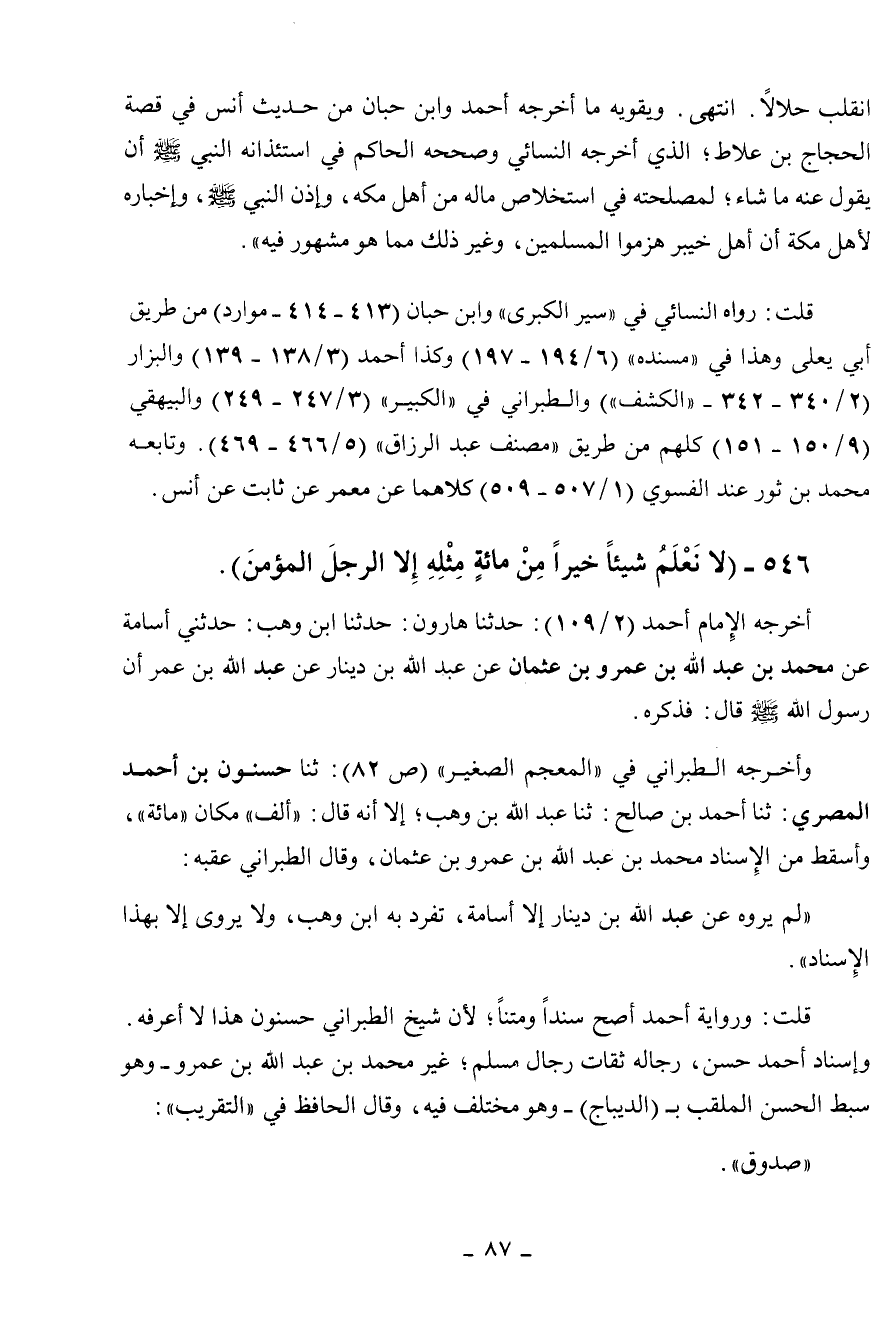 قلت: ورواية أحمد أصح سندا ومتنا لأن شيخ الطبراني حسنون هذا لا أعرفه.