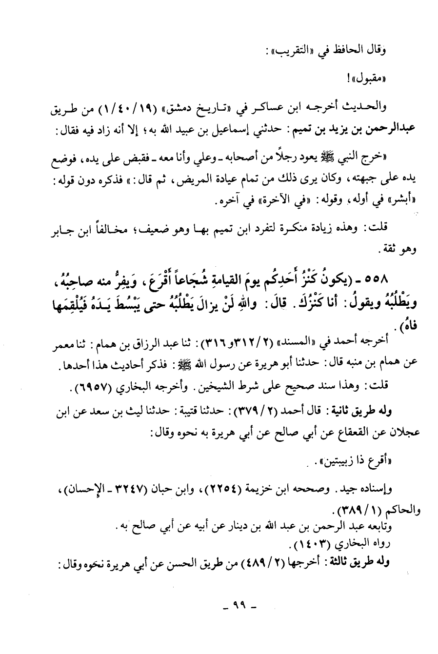 558 - " يكون كنز أحدكم يوم القيامة شجاعا أقرع ويفر منه صاحبه ويطلبه ويقول: