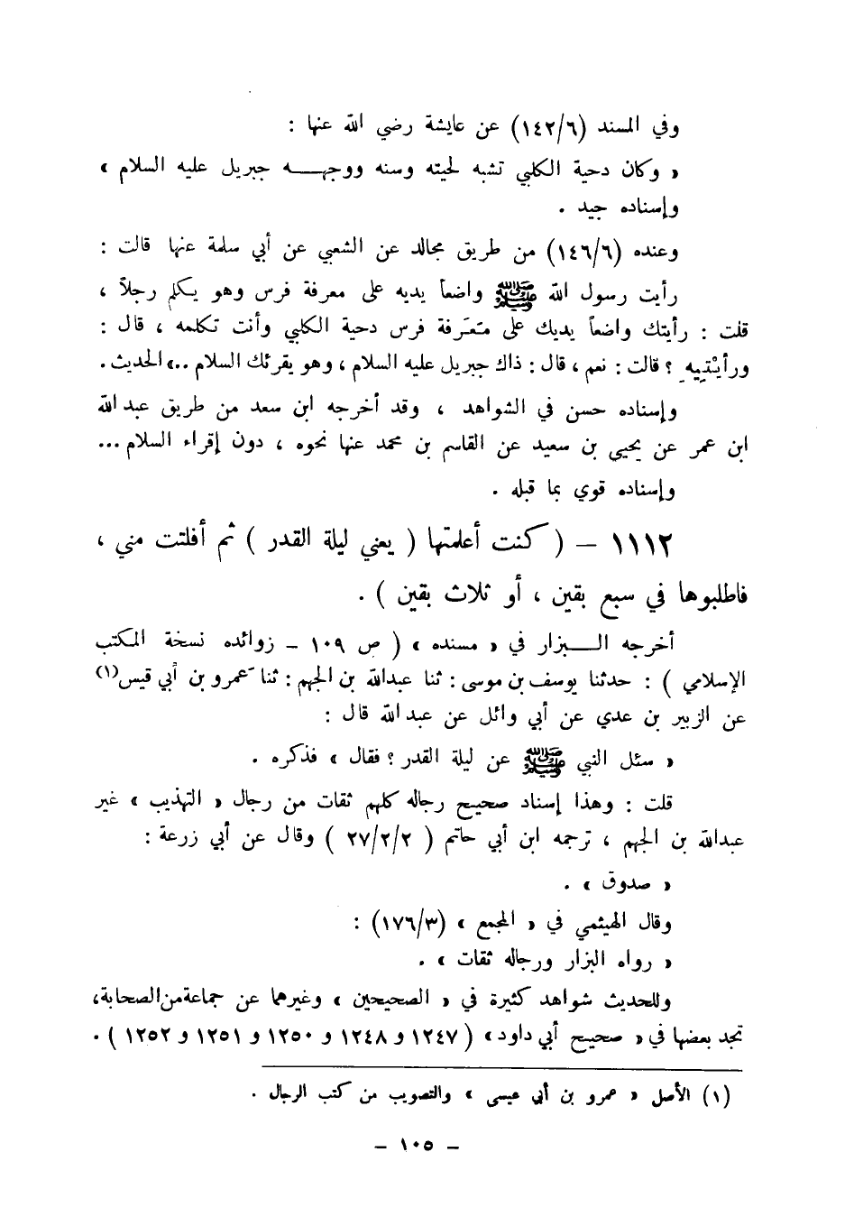 عن أبي وائل عن عبد الله قال: " سئل النبي صلى الله عليه وسلم عن ليلة