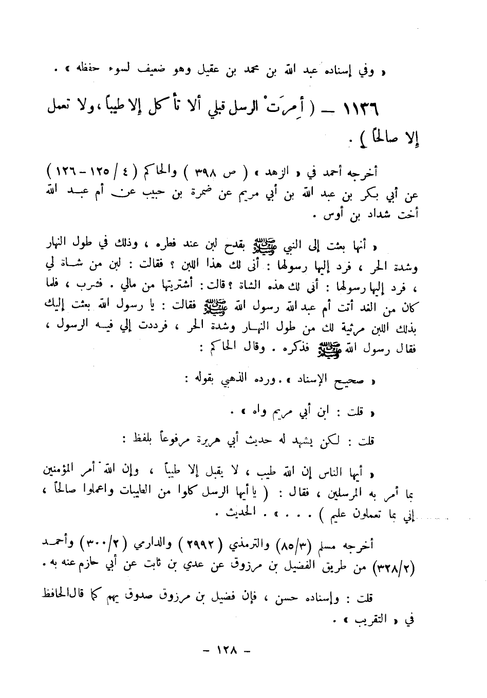 1136 - " أمرت الرسل قبلي ألا تأكل إلا طيبا ولا تعمل إلا صالحا ".
