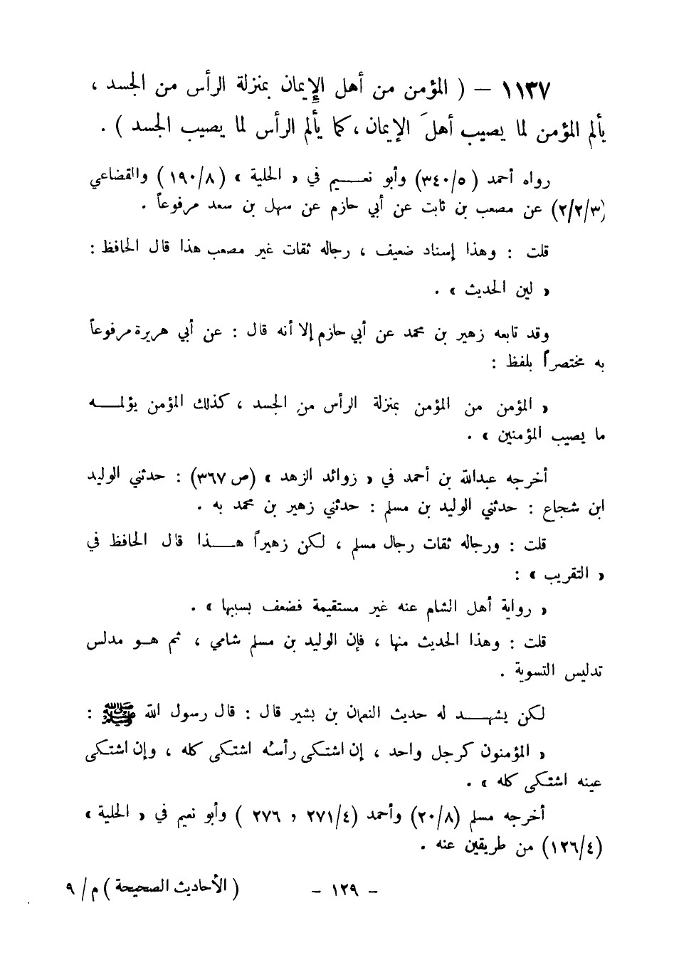 1137 - " المؤمن من أهل الإيمان بمنزلة الرأس من الجسد، يألم المؤمن لما يصيب أهل