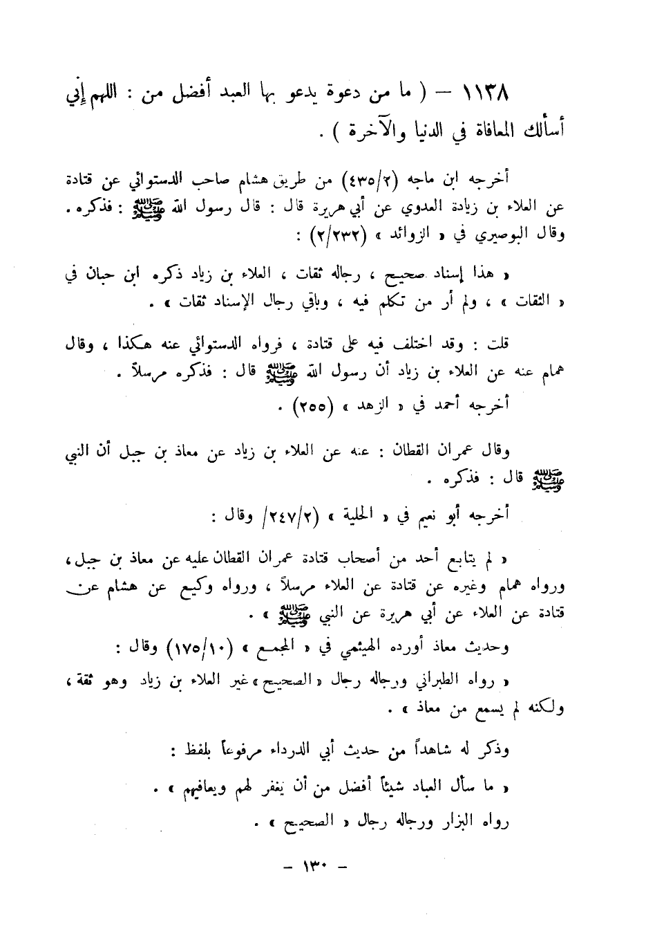 1138 - " ما من دعوة يدعو بها العبد أفضل من: اللهم إني أسألك المعافاة في الدنيا
