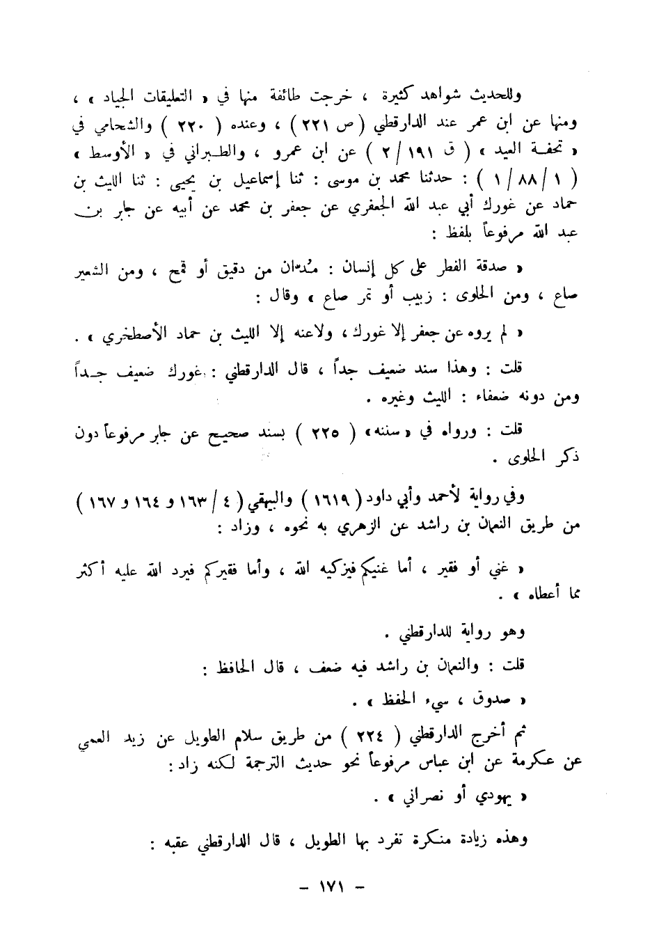الفطر على كل إنسان: مدان من دقيق أو قمح ومن الشعير صاع ومن الحلوى: زبيب