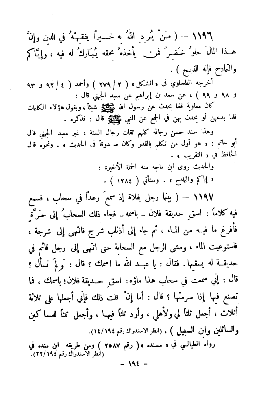 1197 - " بينما رجل بفلاة إذا سمع رعدا في سحاب، فسمع فيه كلاما: اسق حديقة فلان ـ