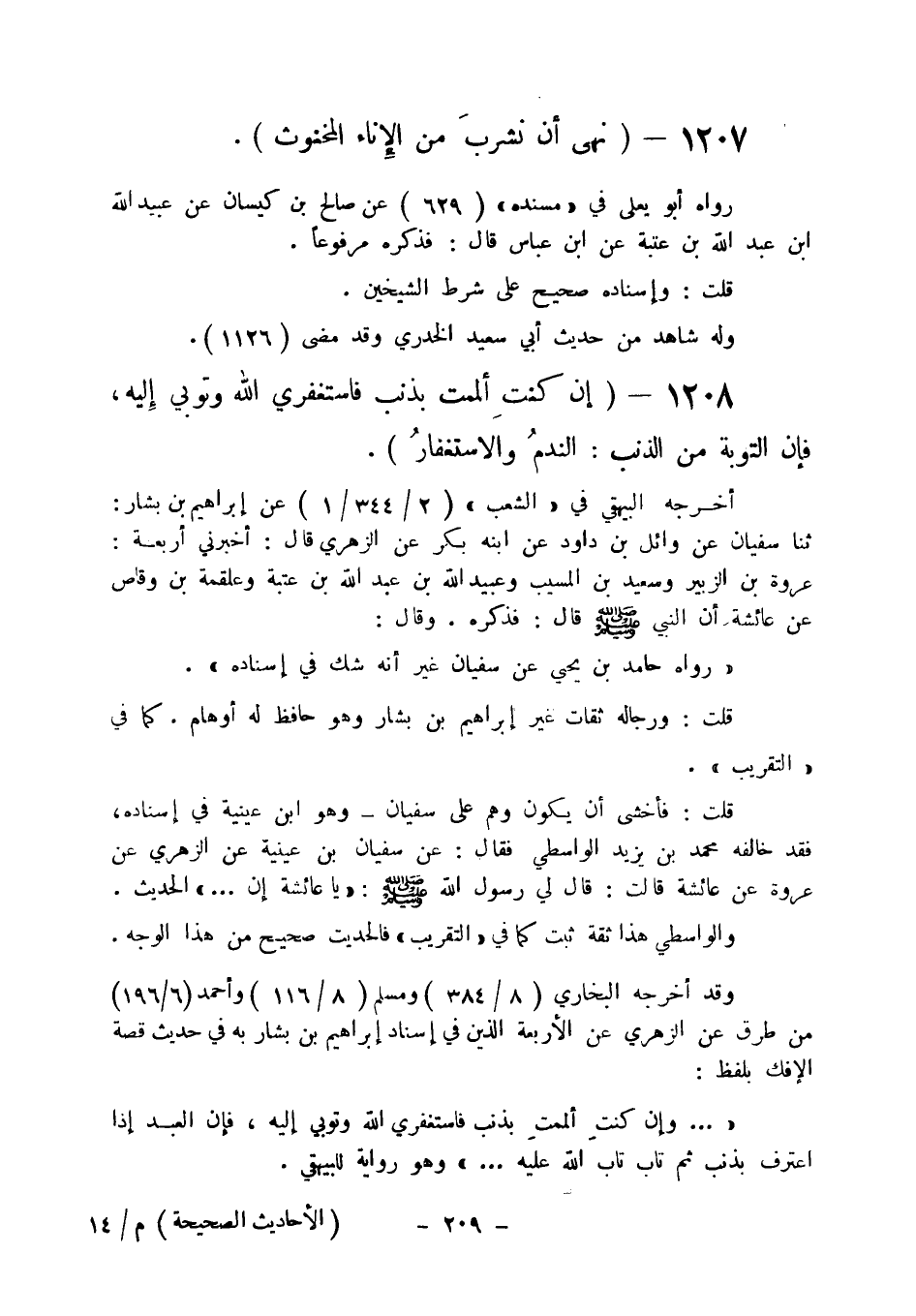 1208 - " إن كنت ألممت بذنب فاستغفري الله وتوبي إليه، فإن التوبة من الذنب: الندم