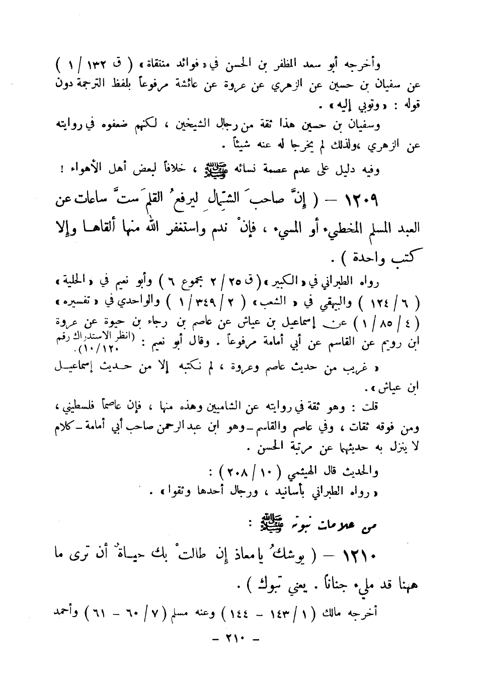 1209 - " إن صاحب الشمال ليرفع القلم ست ساعات عن العبد المسلم المخطئ أو المسيء،
