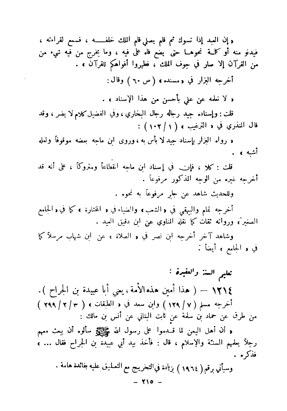 ورواته ثقات كما نقله المناوي عن ابن دقيق العيد. وشاهد آخر أخرجه ابن نصر