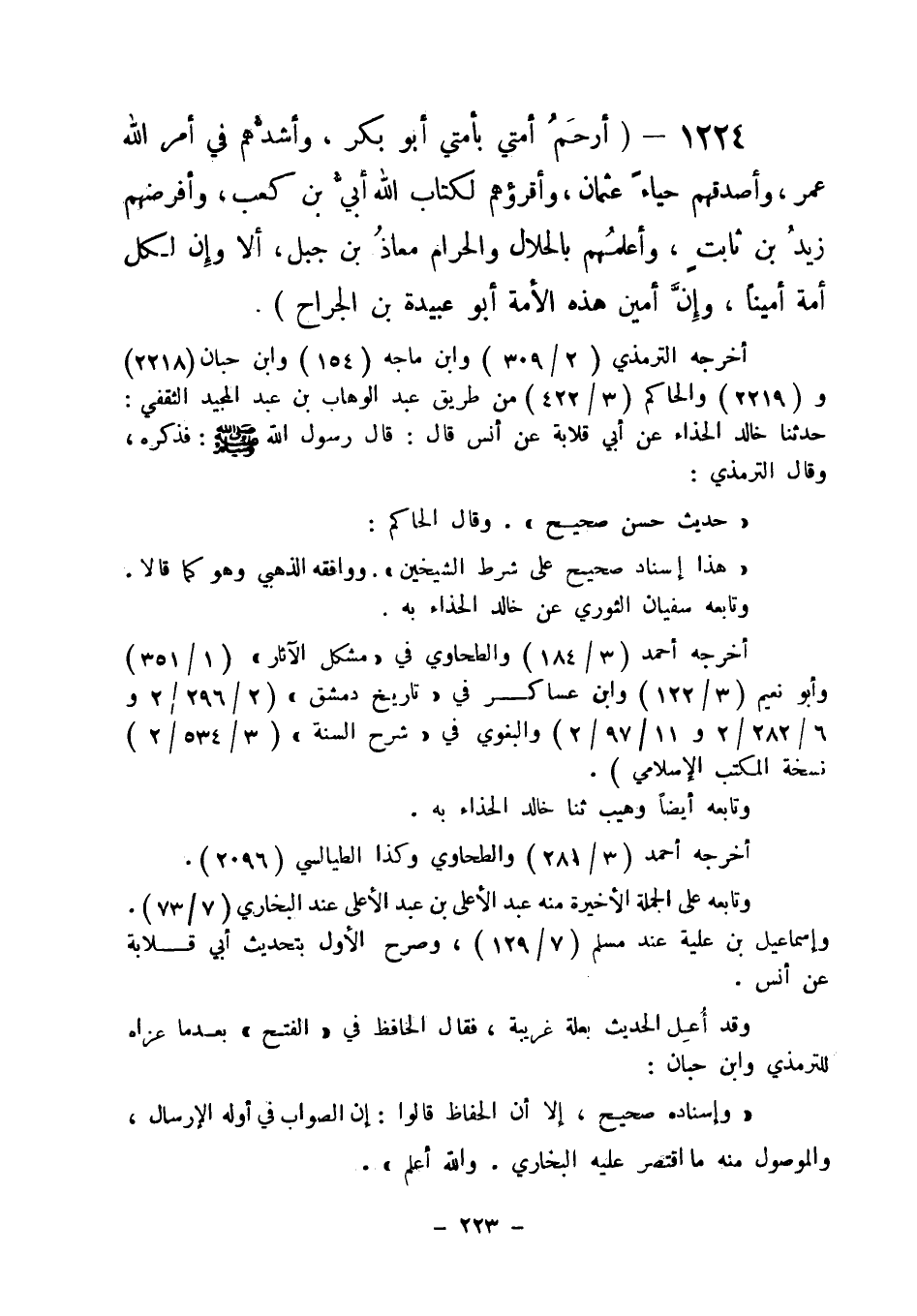 1224 - " أرحم أمتي بأمتي أبى بكر وأشدهم في أمر الله عمر وأصدقهم حياء عثمان