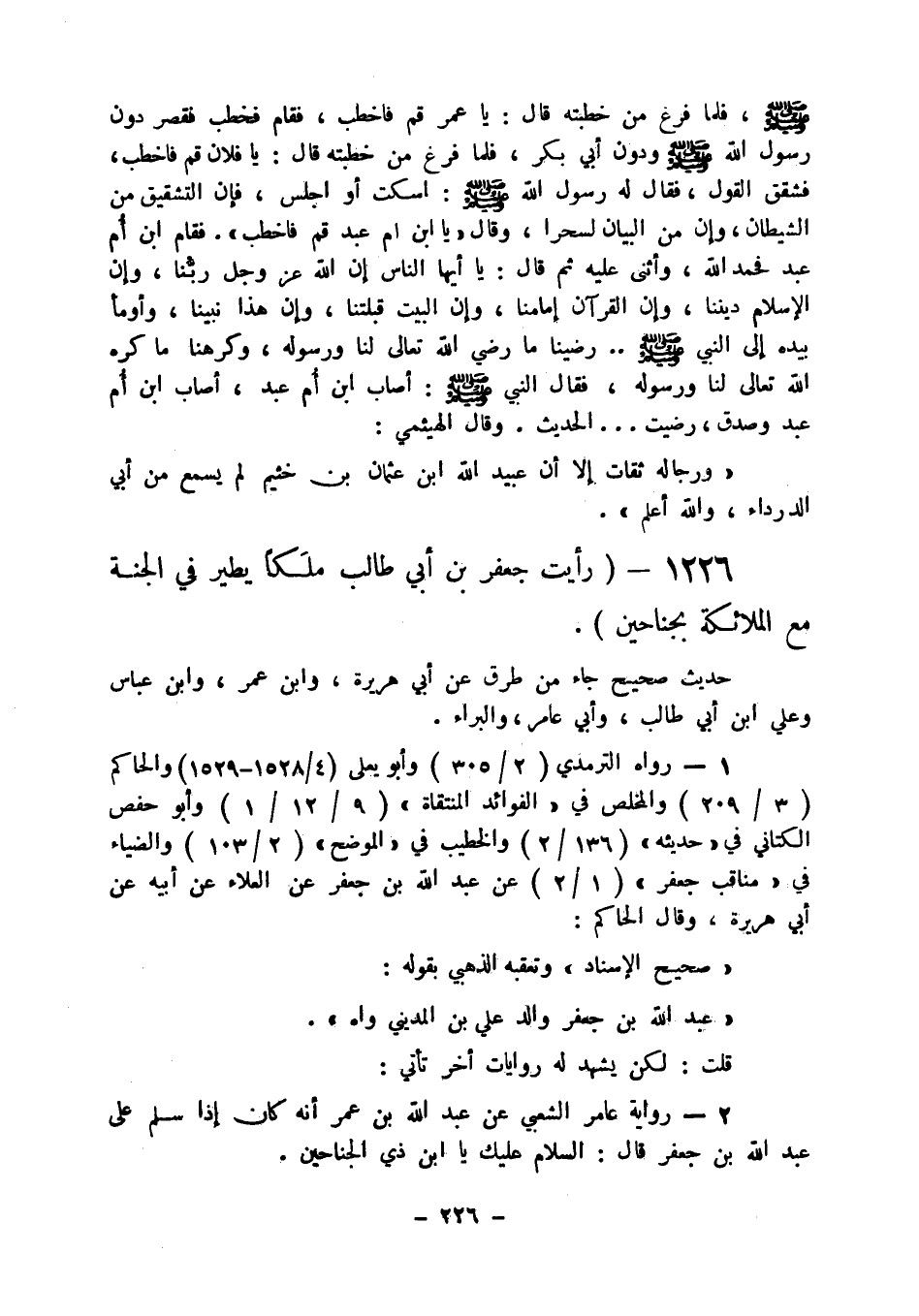 1226 - " رأيت جعفر بن أبي طالب ملكا يطير في الجنة مع الملائكة بجناحين ".