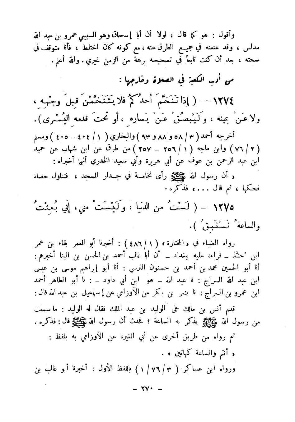 1274 - " إذا تنخم أحدكم فلا يتنخمن قبل وجهه ولا عن يمينه وليبصق عن يساره أو تحت