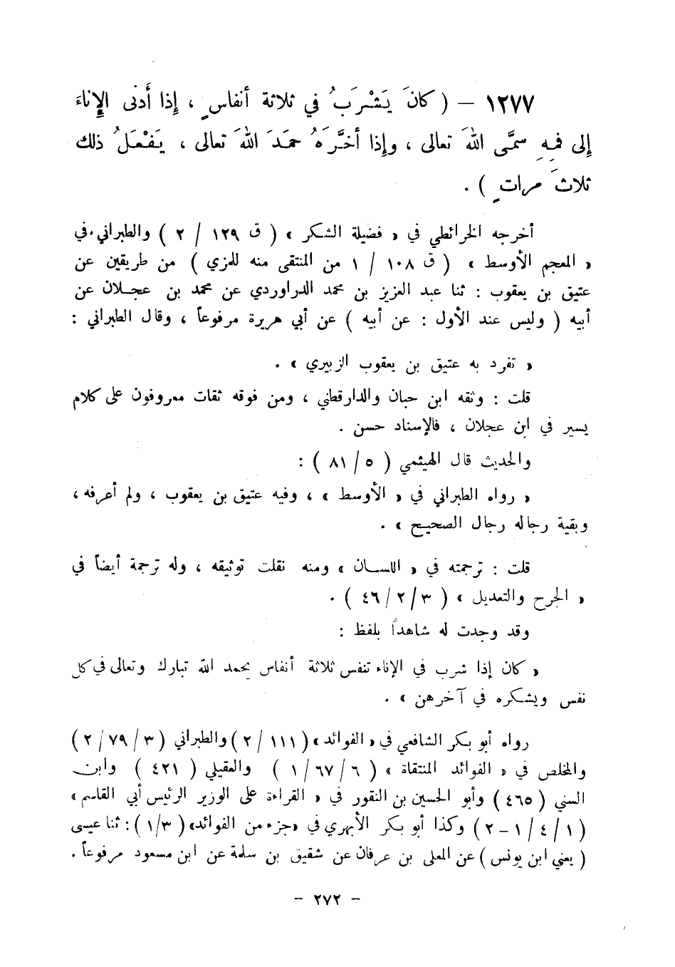 1277 - " كان يشرب في ثلاثة أنفاس، إذا أدنى الإناء إلى فمه سمى الله تعالى وإذا