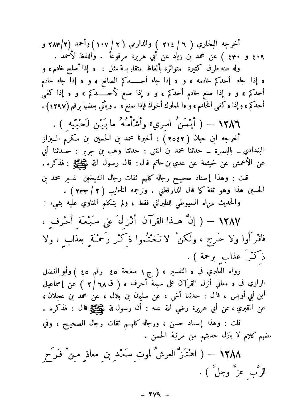 1287 - " إن هذا القرآن أنزل على سبعة أحرف، فاقرأوا ولا حرج ولكن لا تختموا ذكر