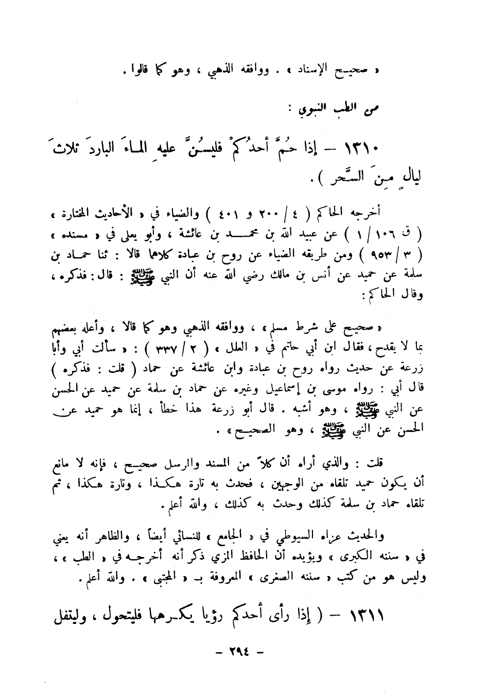 1310 - " إذا حم أحدكم فليسن عليه الماء البارد ثلاث ليال من السحر ".
