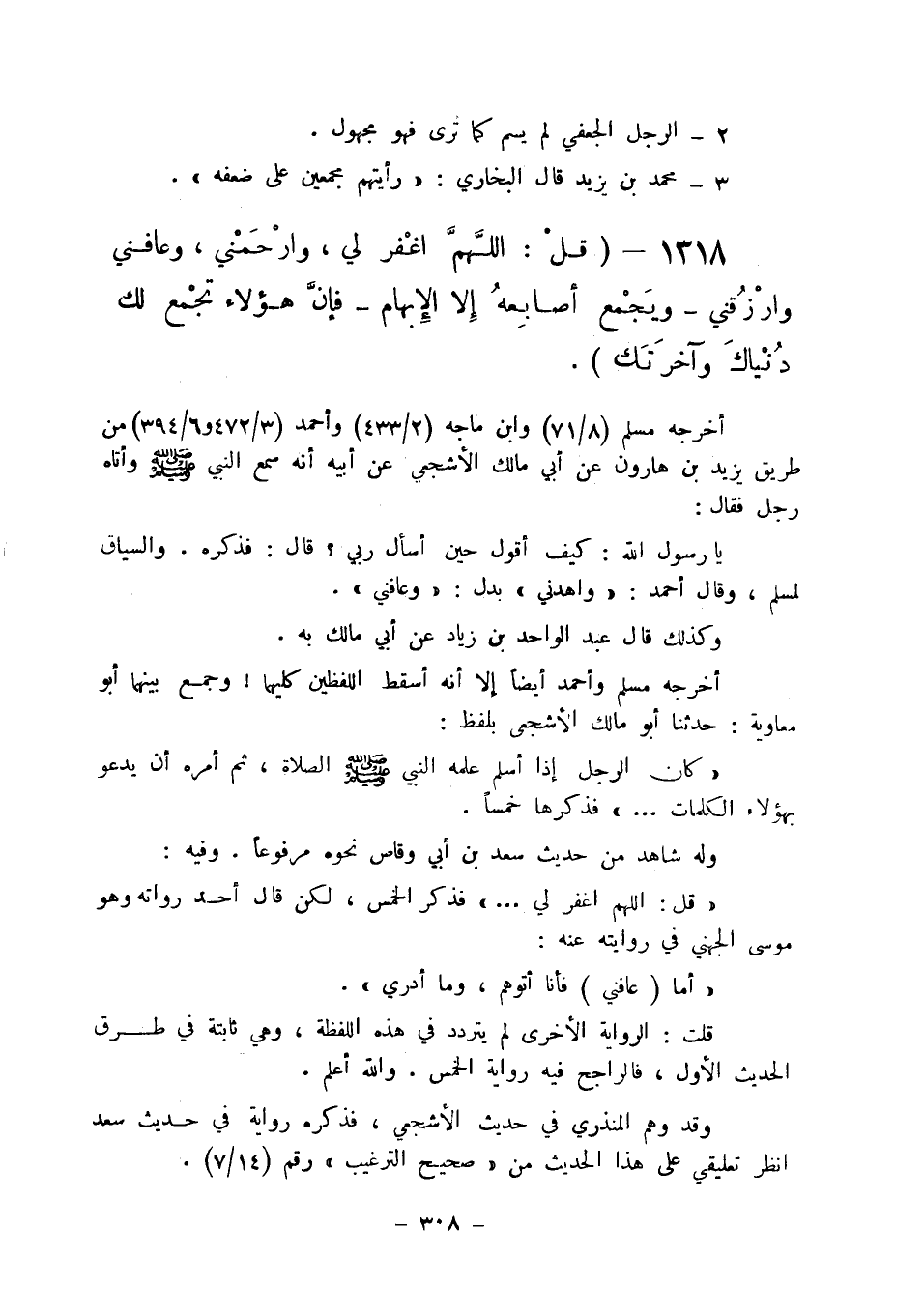 1318 - " قل اللهم اغفر لي وارحمني وعافني وارزقني - يجمع أصابعه إلا الإبهام - فإن