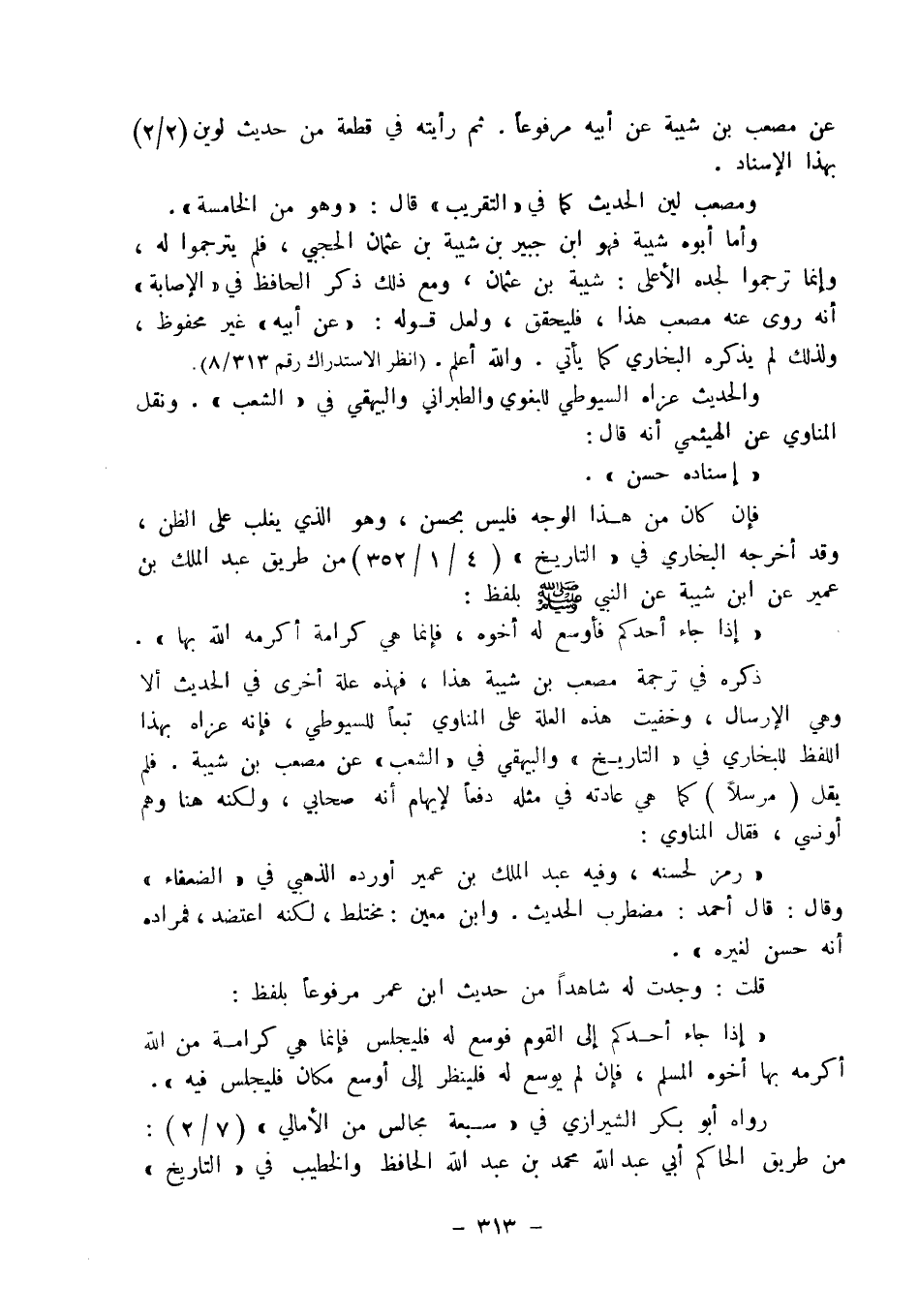 عثمان، ومع ذلك ذكر الحافظ في " الإصابة " أنه روى عنه مصعب هذا، فليحقق،