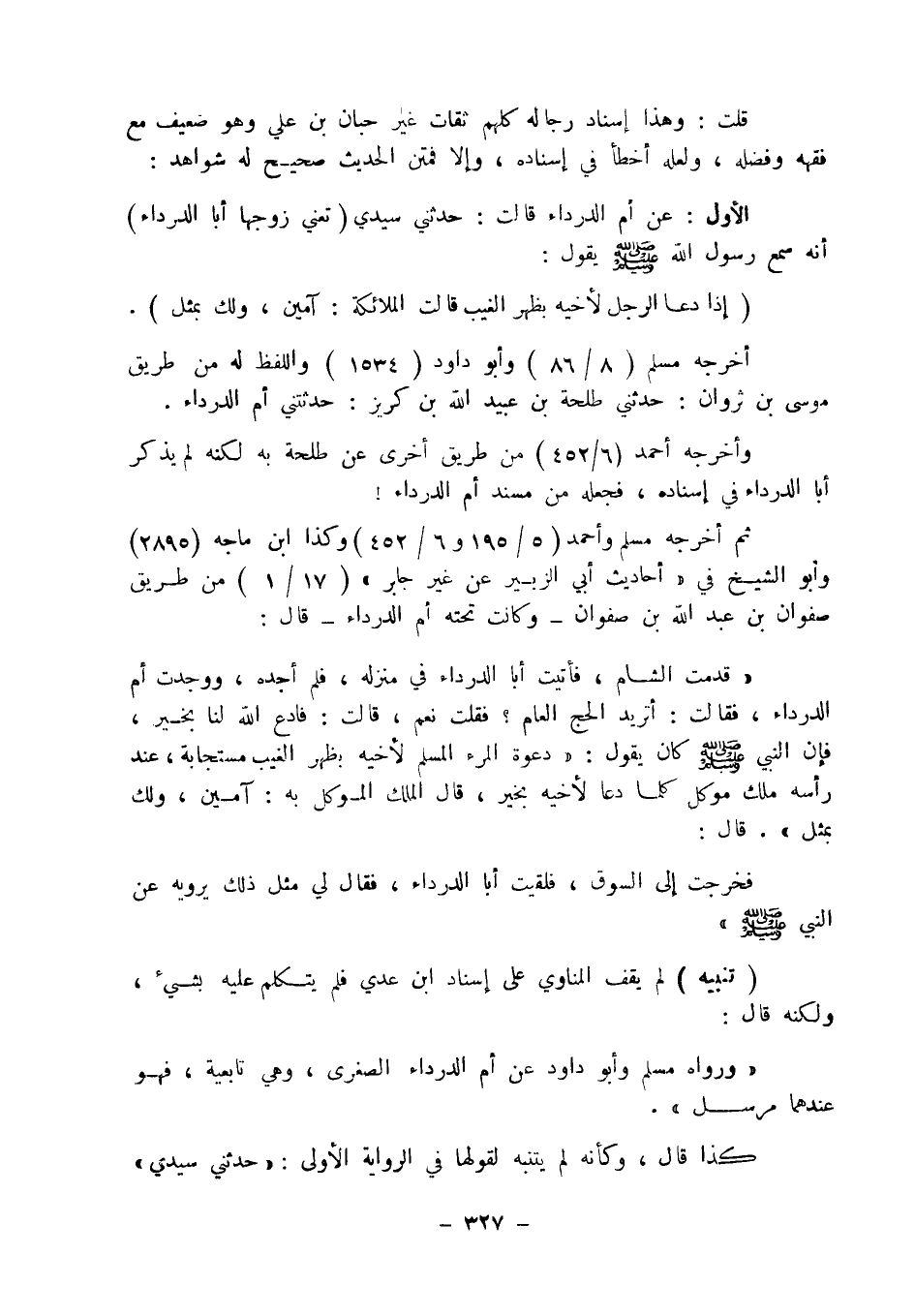 " ورواه مسلم وأبو داود عن أم الدرداء الصغرى، وهي تابعية، فهو عندهما