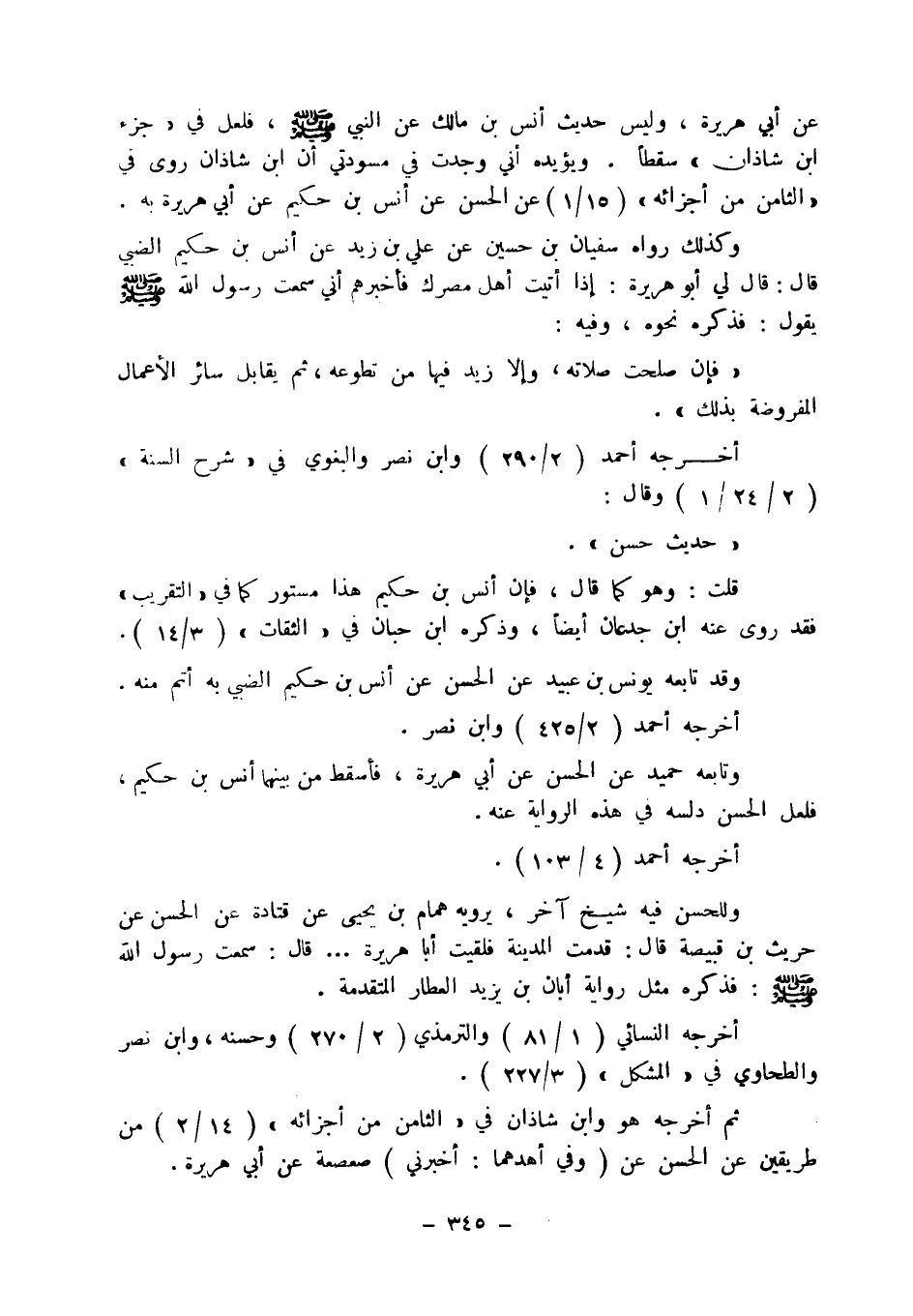 ) عن الحسن عن أنس بن حكيم عن أبي هريرة به. وكذلك رواه سفيان بن حسين عن علي