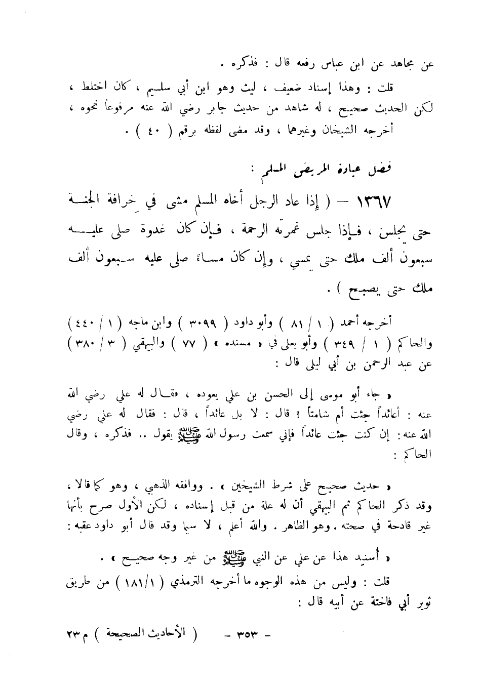 1367 - " إذا عاد الرجل أخاه المسلم مشى في خرافة الجنة حتى يجلس، فإذا جلس غمرته