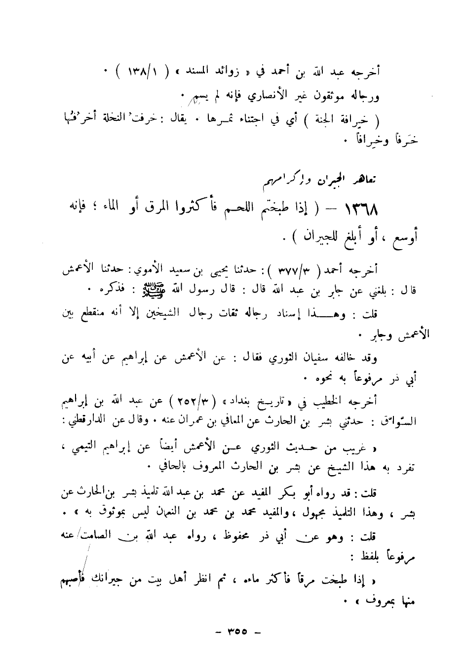1368 - " إذا طبختم اللحم فأكثروا المرق أو الماء، فإنه أوسع، أو أبلغ للجيران ".