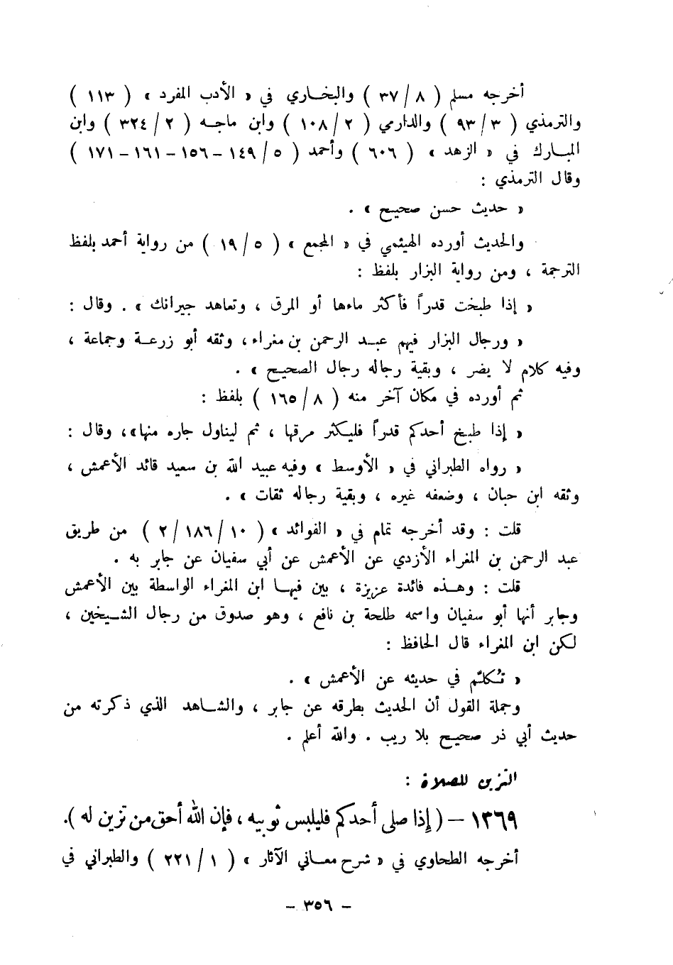 وتعاهد جيرانك ". وقال: " ورجال البزار فيهم عبد الرحمن بن مغراء، وثقه