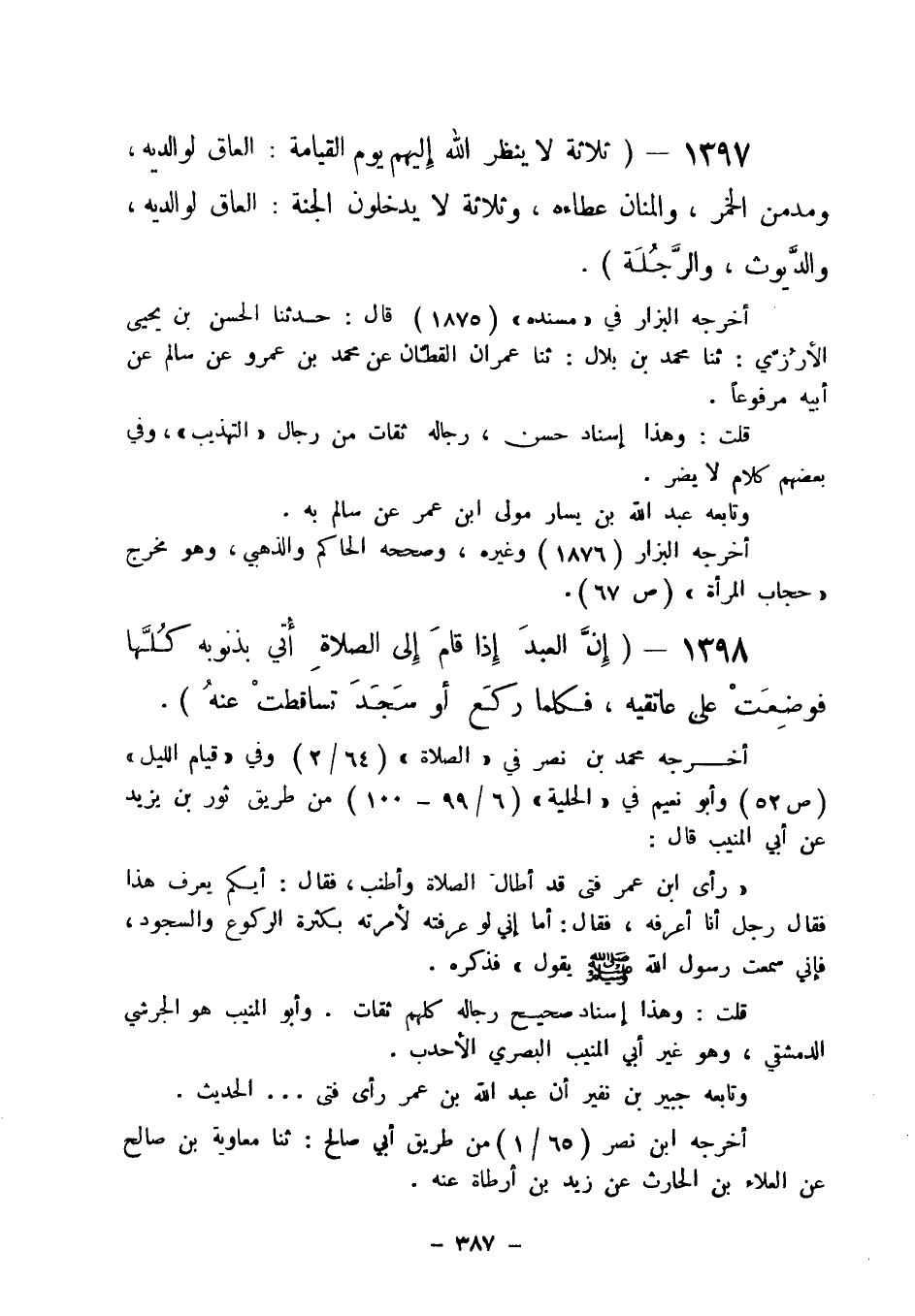 1397 - " ثلاثة لا ينظر الله إليهم يوم القيامة: العاق لوالديه ومدمن الخمر والمنان