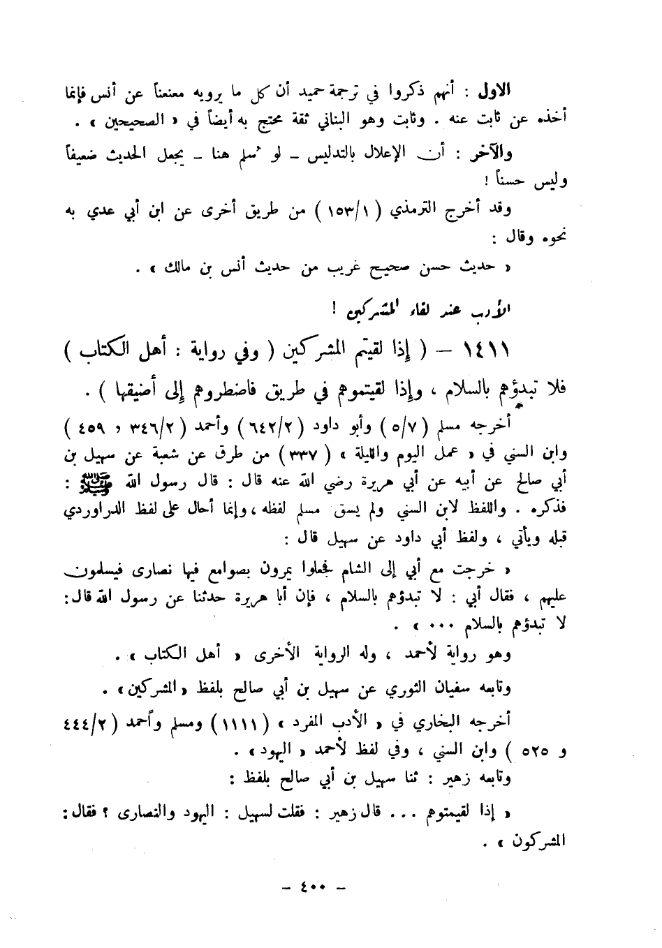 1411 - " إذا لقيتم المشركين (وفي رواية أهل الكتاب) فلا تبدءوهم بالسلام، وإذا