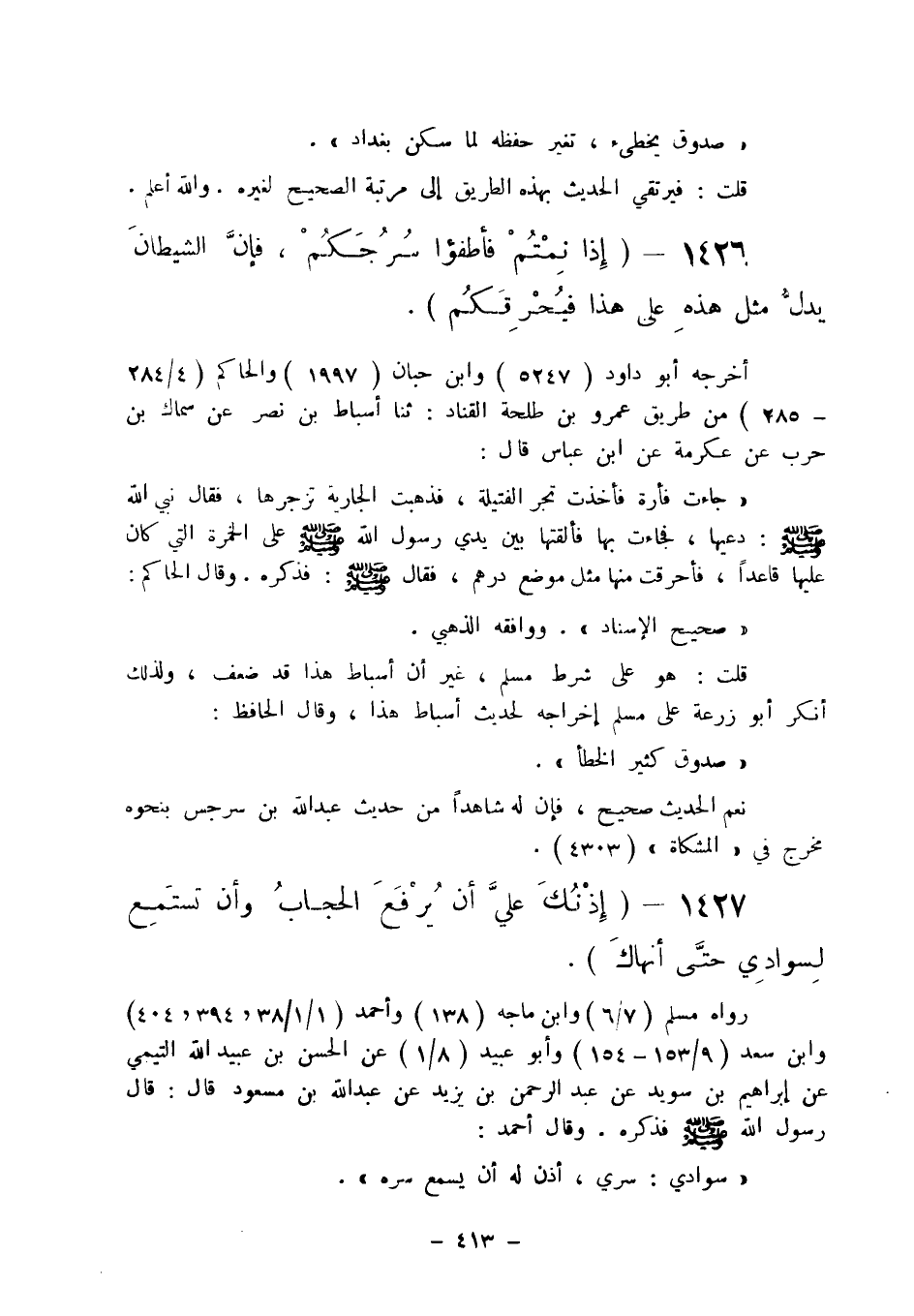 1426 - " إذا نمتم فأطفئوا سرجكم، فإن الشيطان يدل مثل هذه على هذا فيحرقكم ".