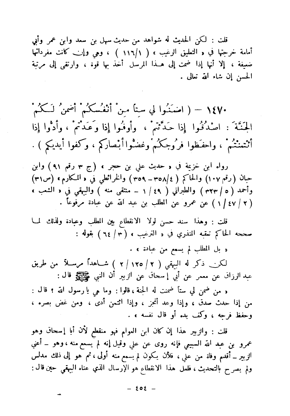 1470 - " اضمنوا لى ستا من أنفسكم أضمن لكم الجنة: اصدقوا إذا حدثتم وأوفوا إذا