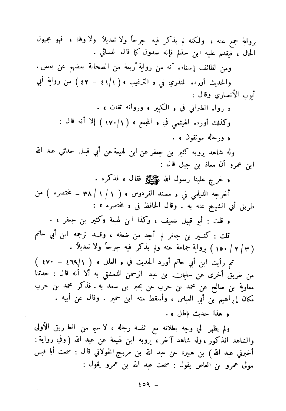 " ورجاله موثقون ". وله شاهد يرويه كثير بن جعفر عن ابن لهيعة عن أبي قبيل