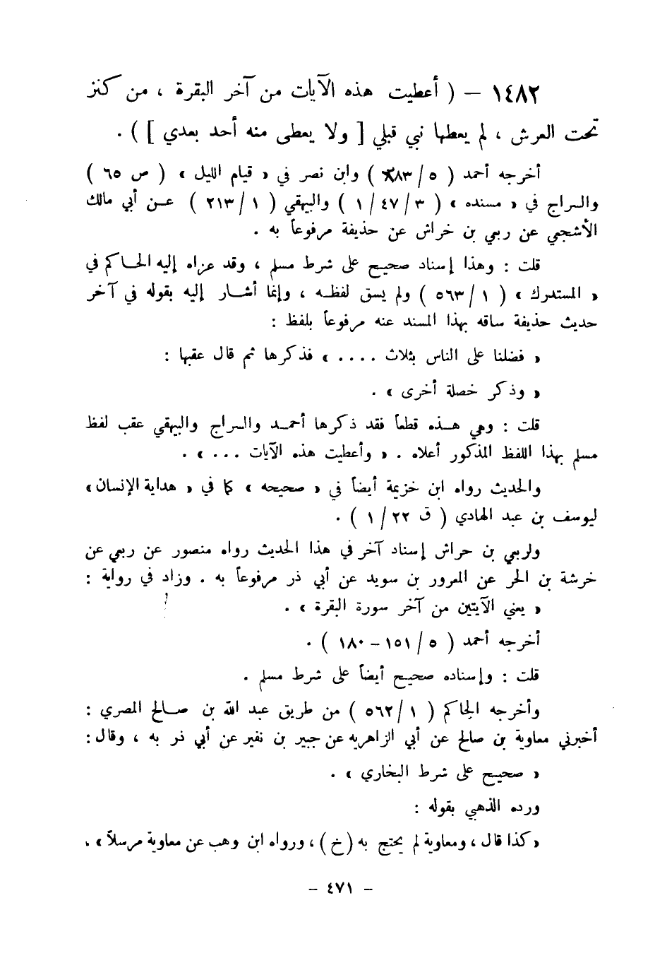 1482 - " أعطيت هذه الآيات من آخر البقرة من كنز تحت العرش لم يعطها نبي قبلي (ولا